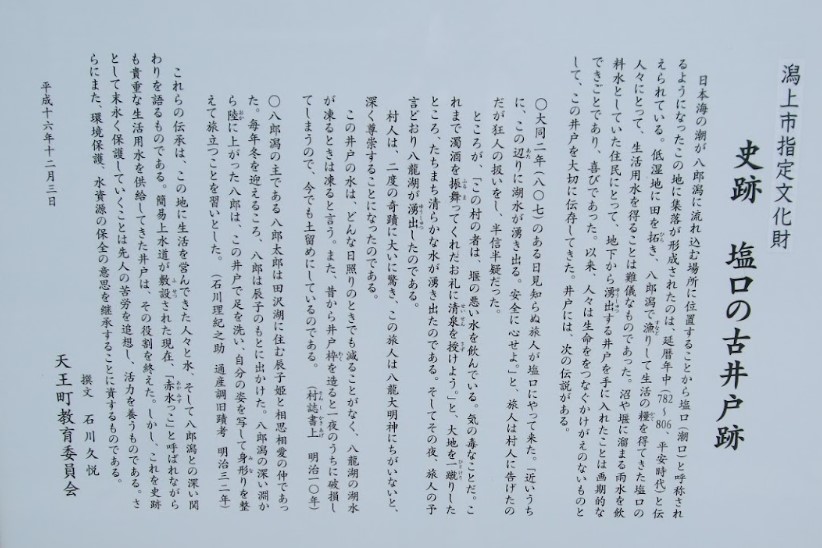 どんな日照りの時にも水が減ることなく、八郎潟に氷が張れば凍り、また固い井戸輪を造れば一夜に破損してしまうという不可思議な井戸といわれている。 井戸の上部の直径47cmで、1mの深さのところに今でも水が湧き出ている。 渋谷地区から簡易水道が引かれるまで塩口の人々の生活を支えてきた。 |