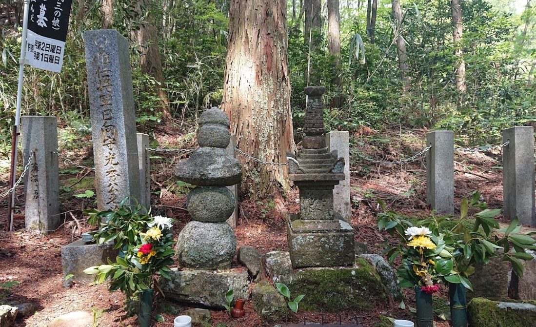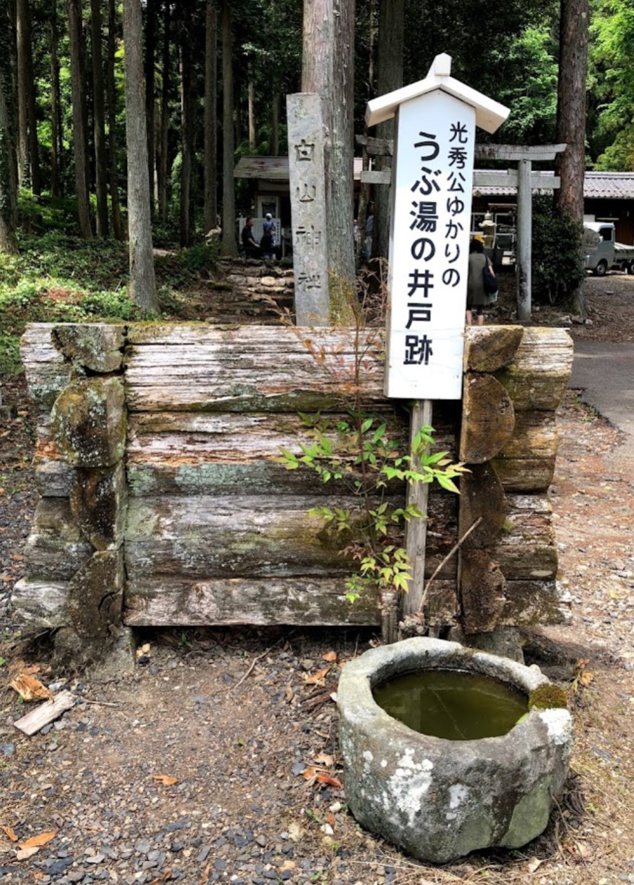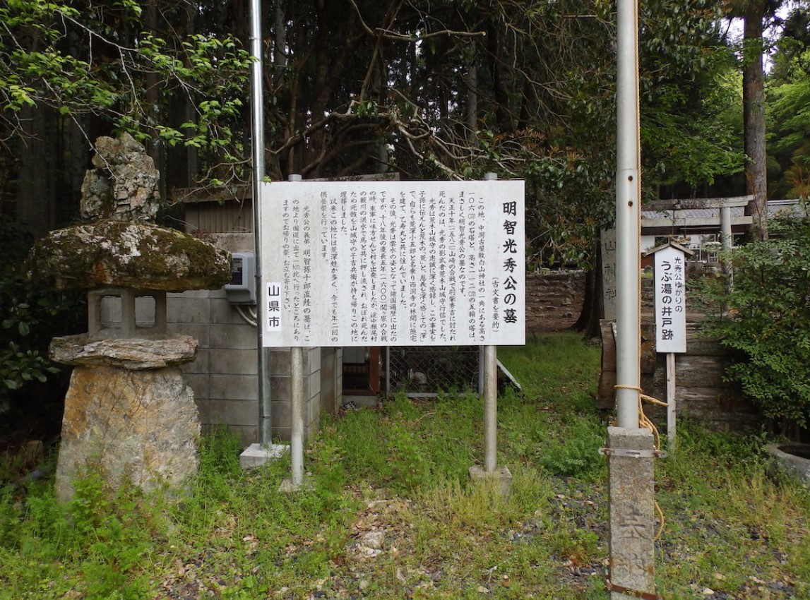 古文書によれば、天正十年(1582年)に秀吉に討たれ死んだのは影武者荒木山城守行信とされ、光秀はその忠誠に深く感銘し、荒木の「荒」と、恩義を深く感じての「深」から荒深小五郎と名乗り西洞寺の林間に住んでいたという。その後慶長五年(1600年)関ヶ原の合戦に東軍に味方するため出発したが、途中の洪水で溺れ死んでしまい、山城守の子吉兵衛が死骸をこの地に持ち帰り埋葬したとされる。 墓への入り口付近に、「うぶ湯の井戸跡」という看板が立ち、史跡として見る事ができる。 |