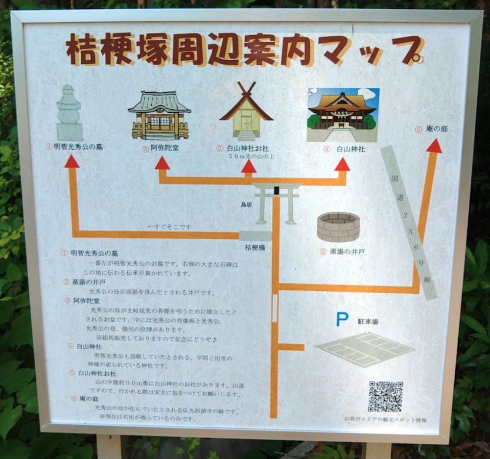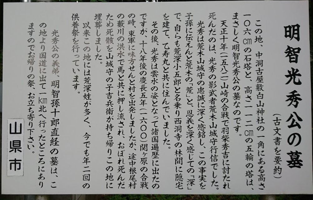 | [言い伝え・概要] | 中洞古屋敷白山神社の一角に桔梗塚があり、高さ106cmの石塔と高さ112cmの五輪の塔が明智光秀公の墓と伝わっている。