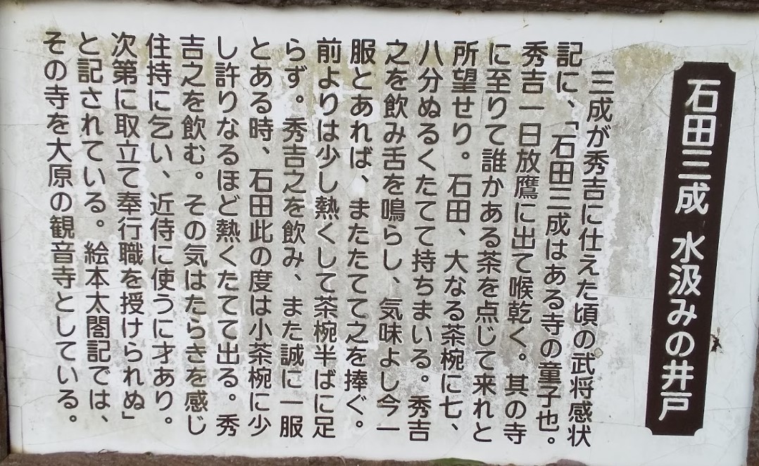| [言い伝え・概要] | 「三献の茶」を汲んだ場所として知られ、石田三成と豊臣秀吉が出会った場所にある井戸。