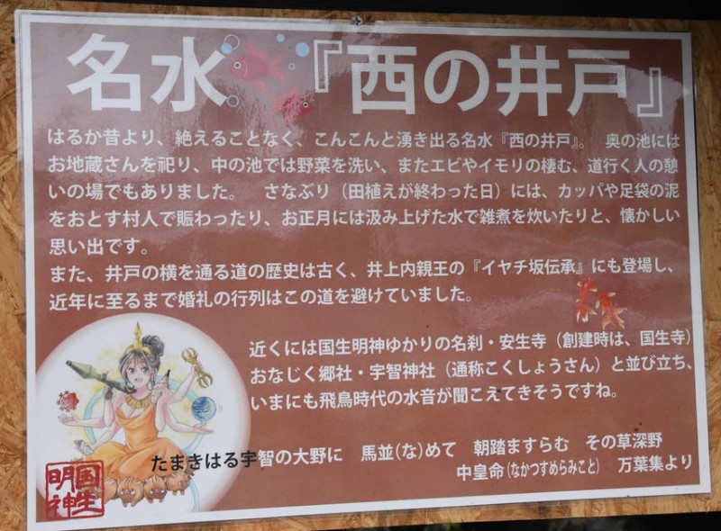 | [言い伝え・概要] | はるか昔よおり、絶えることなく、こんこんと湧き出る名水「西の井戸」