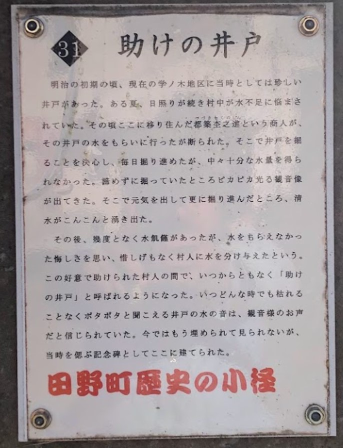 そこで井戸を掘ることを決心し毎日掘り続けたが中々水量が出なかった。 諦めずに掘っていたところピカピカ光る観音像が出てきて、元気を出して更に掘り進めたところ、清水がこんこんと湧き出た。 水をもらえず悔しい思いをした商人は、その後幾度となく水飢饉があったとき惜しげもなく村人に水を与えた。 この好意で助けられた村人の間で、いつからともなく「助けの井戸」と呼ばれるようになった。 (現地掲示板要約) |