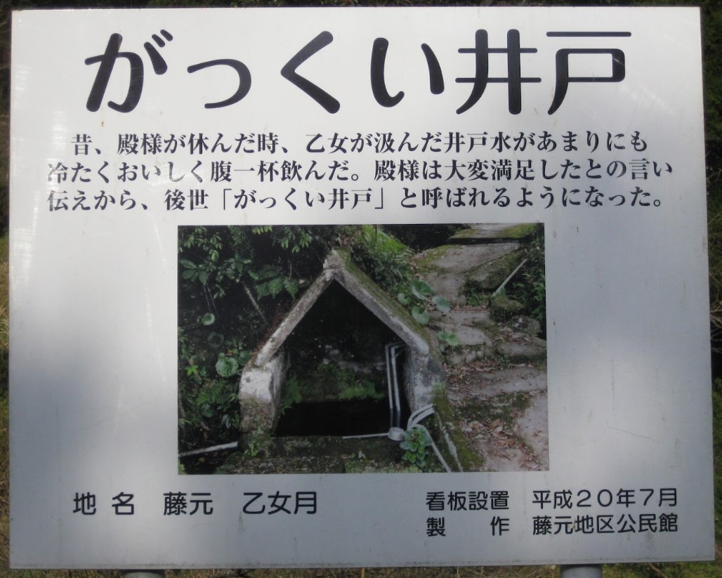 【がっくい井戸】(鹿児島県の水場)鹿児島市下福元町 昔、乙女に水を汲んでもらった殿様が感嘆した 冷たくおいしい井戸水 [名称] がっくい井戸 [場所] 鹿児島県日置市吹上町与倉 [言い伝え・概要] 昔、殿様が休んだ時、乙女が汲んだ井戸水があまりにも冷たくおいしく腹一杯飲んだ。 殿様は大変満足したとの言い伝えから、後世「がっくい井戸」と呼ばれるようになった。 (現地掲示板より) [保全活動] [Google クチコミ] こちら お気に入りに追加※自然の湧水は煮沸して飲用されるとより安全です。※水辺は水難や危険生物に十分気を付けてください。 Click to share on X (新しいウィンドウで開きます) X このエントリーをLINEで送る (新しいウィンドウで開きます) LINEに送る Facebook で共有するにはクリックしてください (新しいウィンドウで開きます) Facebook このエントリーをはてなブックマークに追加 (新しいウィンドウで開きます) はてなブックマーク (場所)井戸 九州 | 鹿児島県 | 日置市 投稿日: 2024年8月16日 投稿者: Sumai事務局