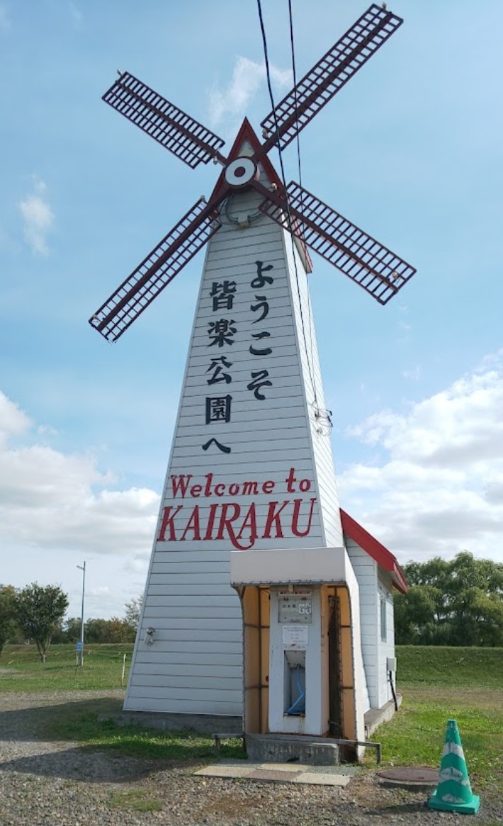 「ようこそ偕楽公園へ」と書かれた風車の前にある温泉スタンド。