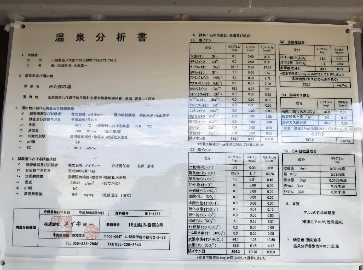 世界的に貴重な特異地形である「甲府大三角形構造盆地」の東南端、北東ー南西走向の曽根断裂温泉帯(1984・田中収)から湧出した、泉温・湧出口温度44.9度の高温泉、湧出量毎分198リットル・日量285トン、泉質アルカリ性単純温泉という豊かな大自然の名湯。平成11年湧出。 泉質:アルカリ性単純温泉 泉温:44.9度 湧出量:198リットル/分 温泉効能:神経痛 / 筋肉痛 / 関節痛 / 五十肩 / 運動麻痺 / 関節のこわばり / 打ち身 / くじき / 慢性消化器病 / 痔疾 / 冷え性 / 病後回復期 / 疲労回復 / 健康増進 |