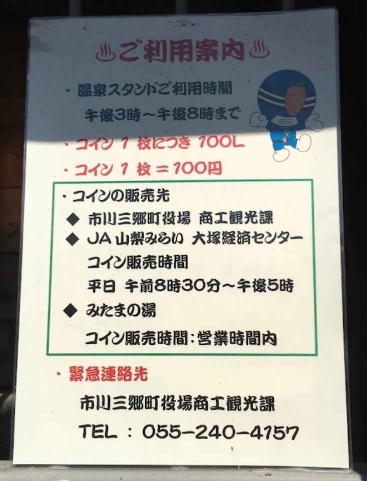 | [言い伝え・概要] | 「みはらしの丘 みたまの湯」で専用コイン(100円)を買って給湯することができる温泉スタンド。