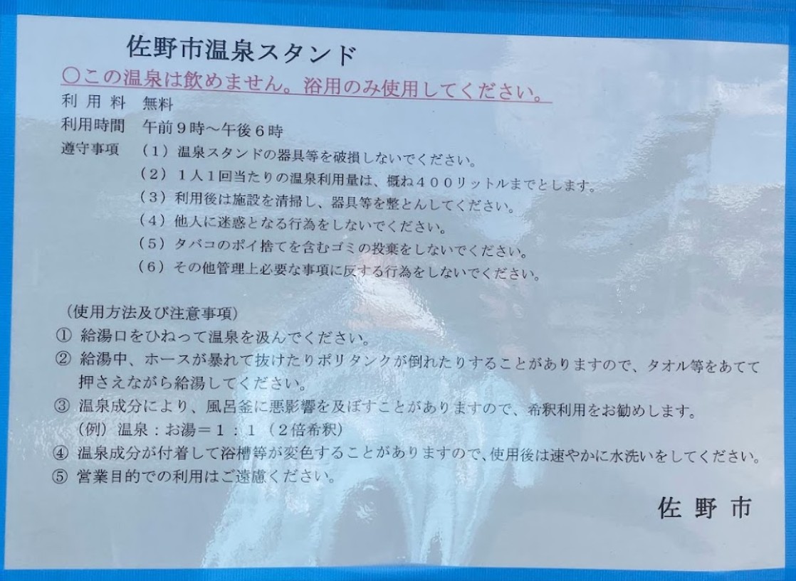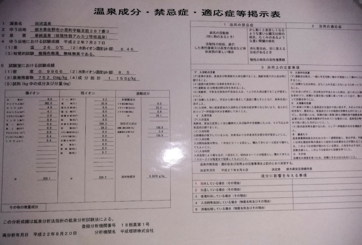 源泉名 田沼温泉 泉質 単純温泉(低張性弱アルカリ性低温泉) 泉温 26℃ 水素イオン濃度(pH値) 8.46 特徴 微褐色微濁、無味無臭 利用時間 午前9時~午後6時 利用料 無料 備考 1人1回あたりの温泉利用料は、概ね400リットルまで 希釈利用推奨 温泉:お湯=1:1 |