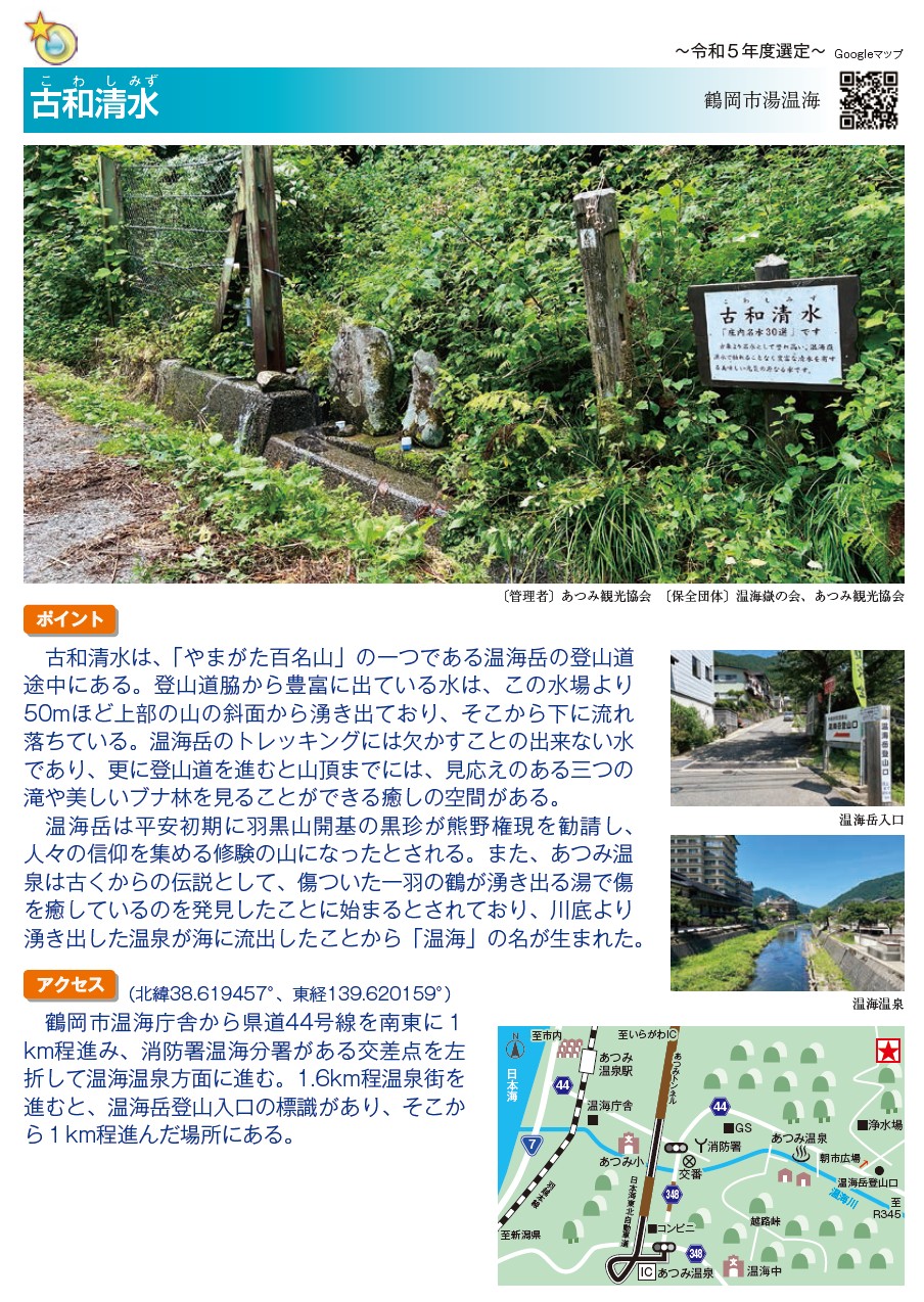 【古和清水】(山形県の湧水)鶴岡市湯温海 温海嶽トレッキングコースの途中にある 平安の古来より誉れ高い名水