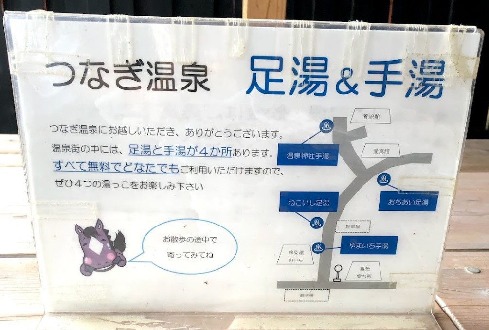 [言い伝え・概要] つなぎ温泉の観光案内所近くに4か所ある足湯(2か所)と手湯(2か所)のひとつ。