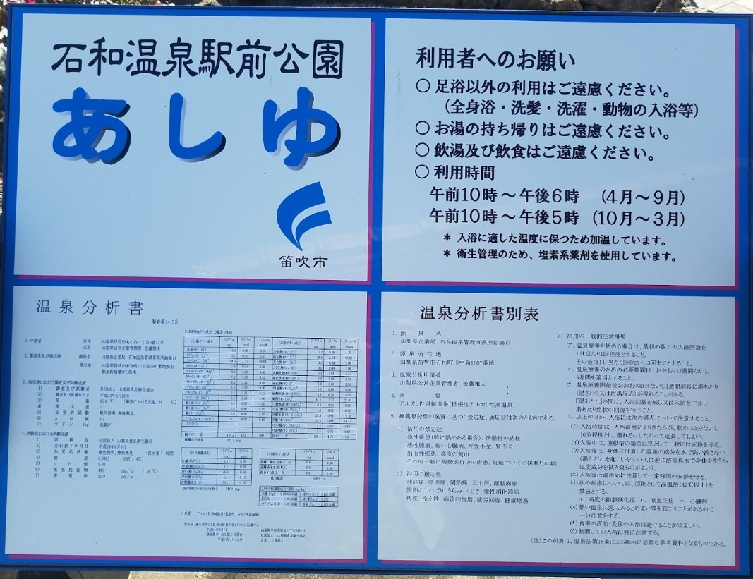 【石和温泉駅前公園 あしゆ】(山梨県の水場)笛吹市石和町駅前 旅の疲れを癒せる 駅ロータリー外側にある広い屋根付き無料足湯 [名称] 石和温泉駅前公園 あしゆ [場所] 山梨県笛吹市石和町駅前18 [言い伝え・概要] ■敷地面積 327.53平方メートル ■建物 あずま屋 PC(一部木造) 平屋建 延床面積 49.14平方メートル ■供用開始 平成20年4月1日■利用時間 ○夏季(4月~9月) 午前10時~午後6時 ○冬季(10月~3月) 午前10時~午後5時 ■利用料 無料 ■泉質 アルカリ性単純温泉(低帳性弱アルカリ性高温泉) [保全活動] [Google クチコミ] こちら 出典 笛吹市 お気に入りに追加※自然の湧水は煮沸して飲用されるとより安全です。※水辺は水難や危険生物に十分気を付けてください。 Click to share on X (新しいウィンドウで開きます) X このエントリーをLINEで送る (新しいウィンドウで開きます) LINEに送る Facebook で共有するにはクリックしてください (新しいウィンドウで開きます) Facebook このエントリーをはてなブックマークに追加 (新しいウィンドウで開きます) はてなブックマーク (場所)足湯 山梨県 | 中部 | 笛吹市 投稿日: 2024年11月2日2024年11月2日 投稿者: Sumai事務局