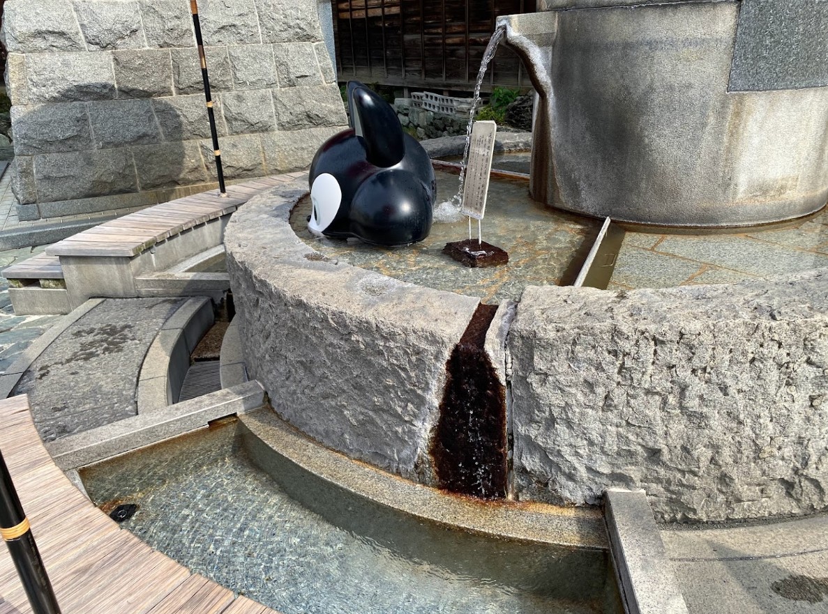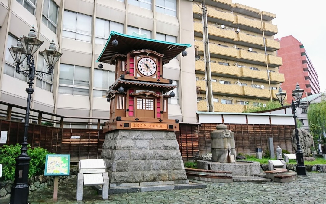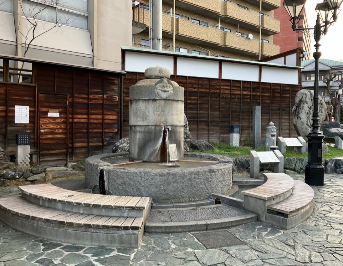 【放生園「足湯」】(愛媛県の水場)松山市道後湯之町 シックなカラクリ時計の隣にある 駅前の休憩スポット・道後温泉足湯