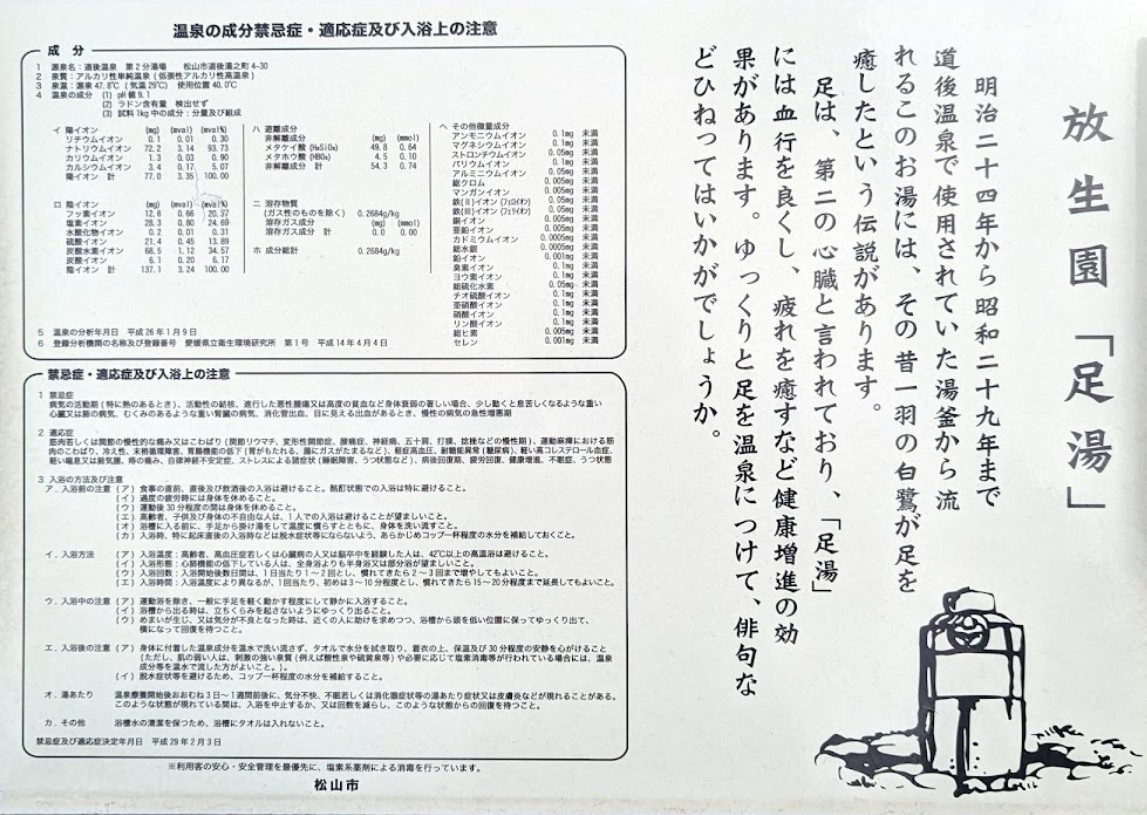 [言い伝え・概要] 放生園は、道後温泉駅前、道後商店街の入口にあり、神代の昔、道後の湯で傷を癒したという白鷺の足跡の残った「鷺石」や、明治24年から昭和29年まで道後温泉本館で使用した湯釜から出る「足湯」、「坊っちゃんカラクリ時計」などがあり、夜にはレトロなガス灯のともる温泉情緒溢れる人気のスポットになっています。