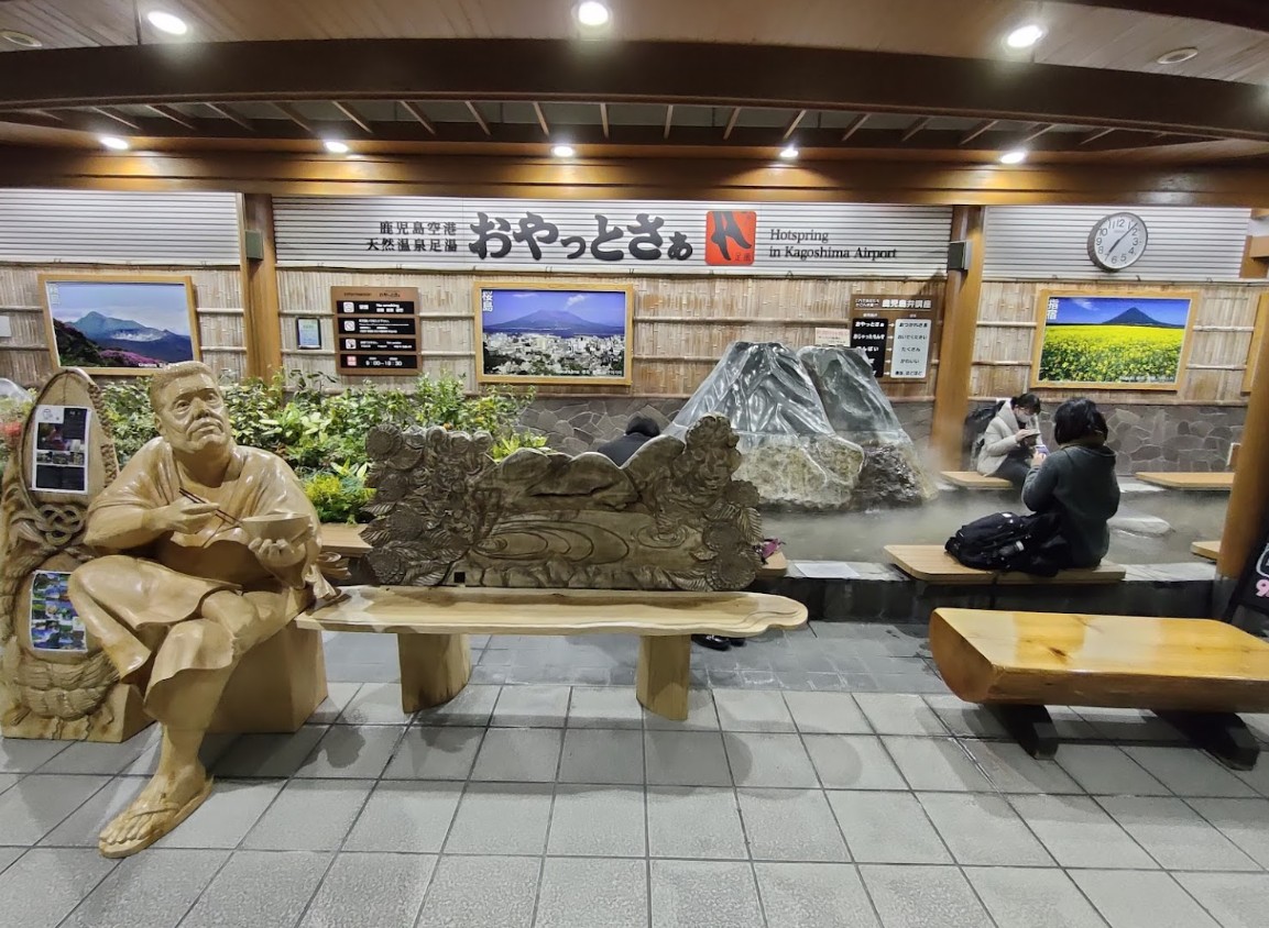 桜島や霧島をイメージした石製の山から温泉が注ぎ、屋根や梁・柱等 鹿児島弁で「お疲れさま」「ご苦労さま」という意味が込められたのが「おやっとさぁ」という言葉。 泉源 国内線ターミナル前鹿児島空港駐車場内 地下1,498m |