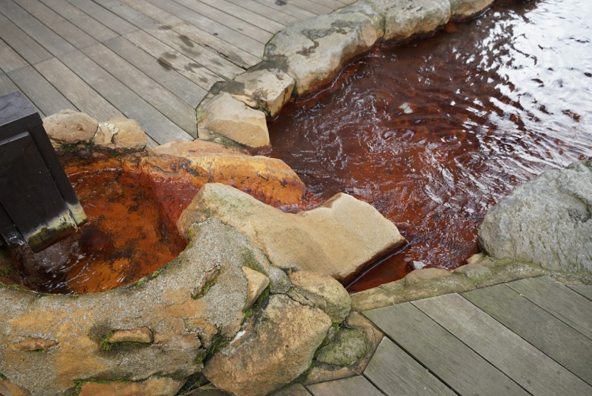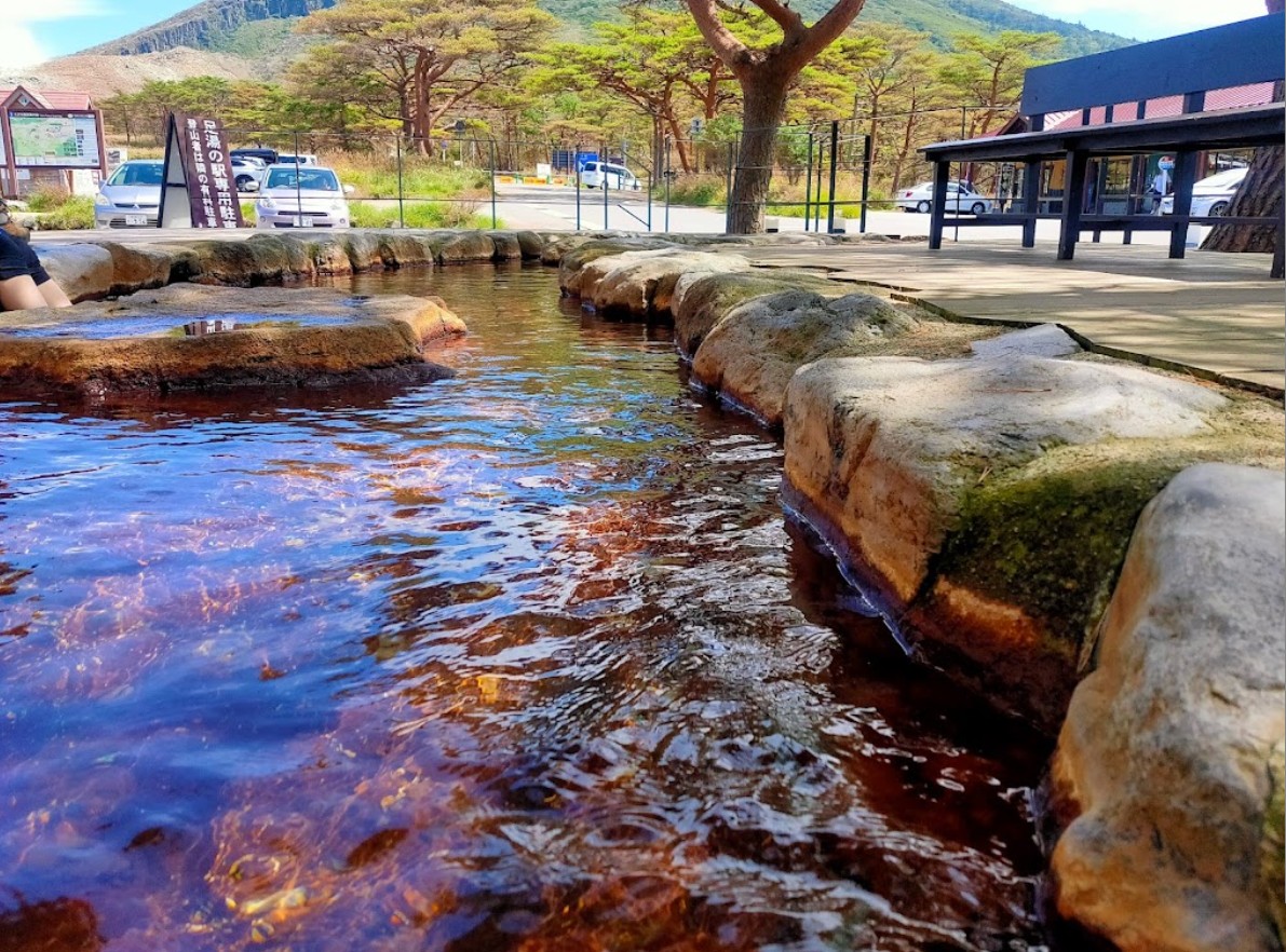 川湯をイメージした足湯は、湯温35~6度で24時間、足を浸すことができます。10~15分ほど足を浸すと足裏が刺激されポカポカと温まり疲れがほぐされ、多くの登山客や観光客が利用する人気の休憩スポットです。 |