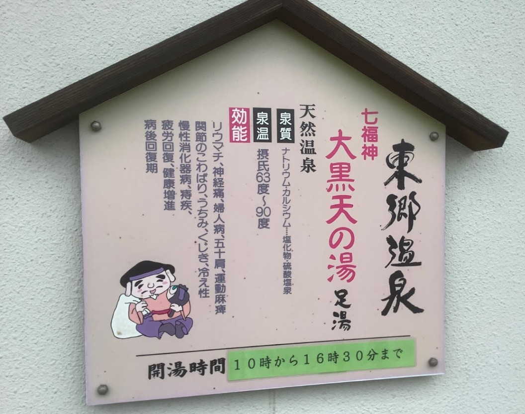 | [言い伝え・概要] | 手作り焼きたてパン&喫茶「プティシュー」の屋内に設置された足湯で、東郷温泉七福神の第七湯「大黒天の湯」と呼ばれ、窓越しに東郷湖が一望できるようになっている。