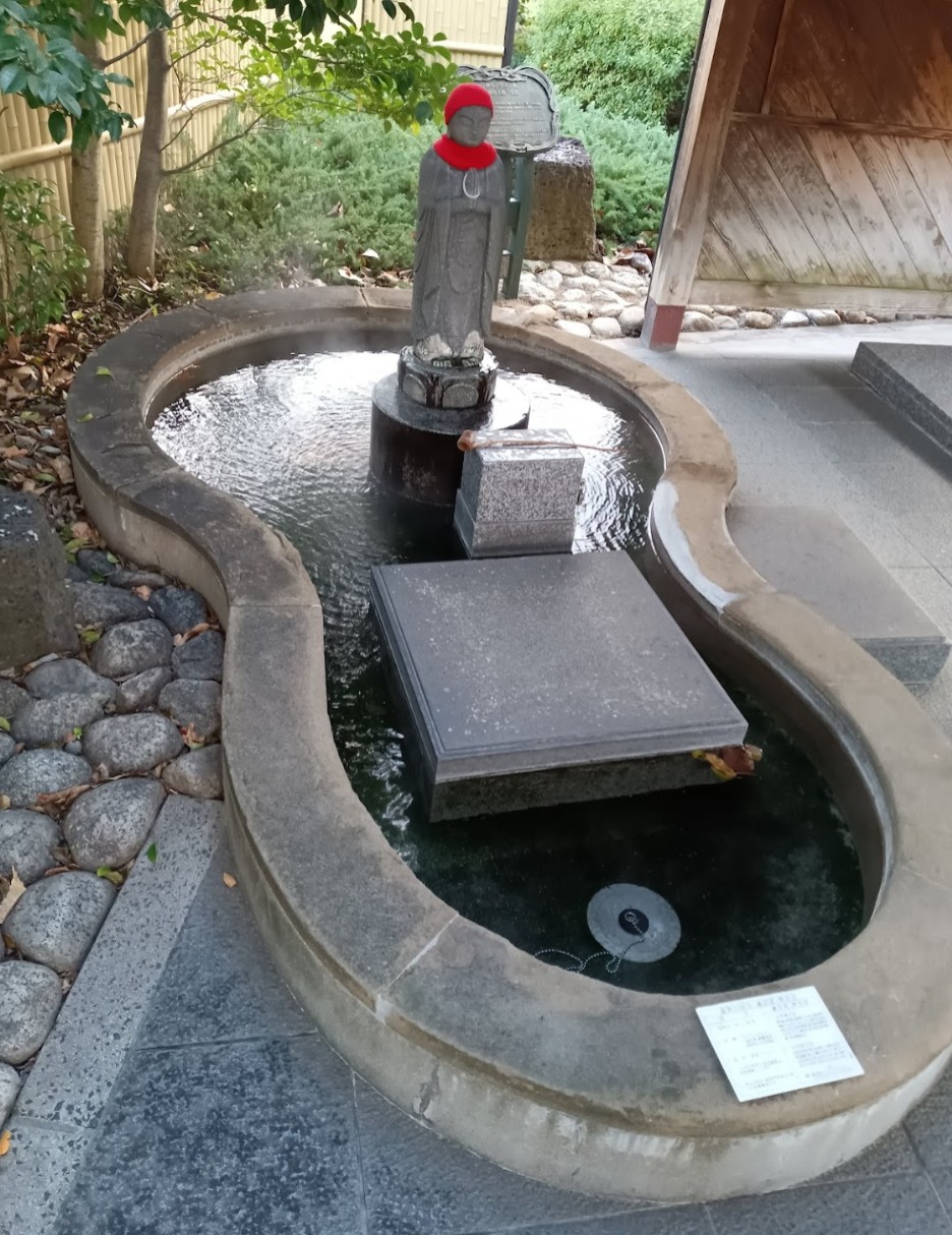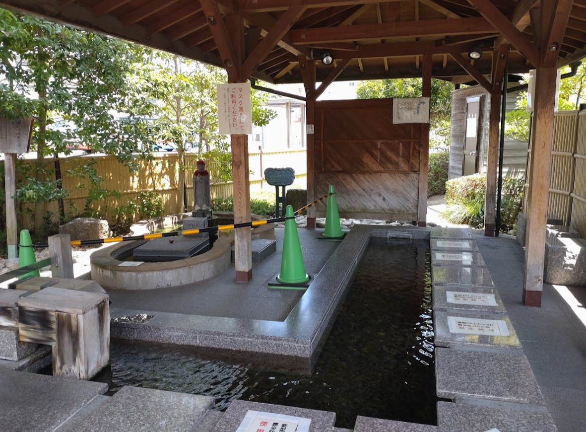 【お湯かけ地蔵足湯】(島根県の水場)松江市中原町 お地蔵様にお湯をかけ手を合わせると幸せになれる 松江しんじ湖温泉駅前の源泉かけ流し足湯