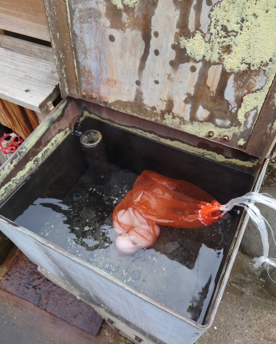 卵と網を近くのショップで購入または持参して、蛇口両脇の蓋を開けてセットし、12分~14分位待ってから網を上げると温泉卵が出来上がる。