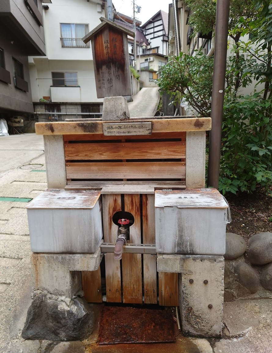 【温泉卵場】(長野県の水場)下高井郡野沢温泉村寺湯 温泉街の坂の途中 角地に設置された温泉卵施設