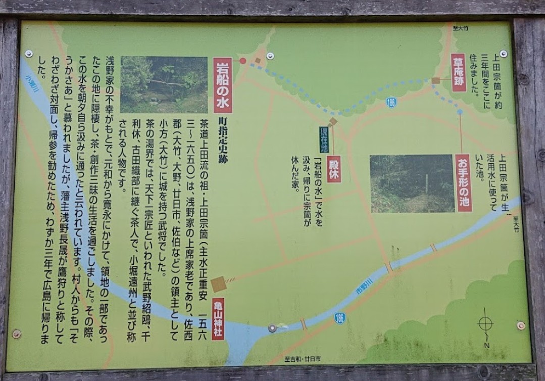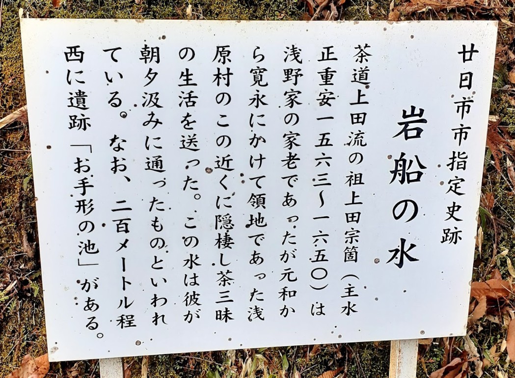 【岩船の水】(広島県の湧水)廿日市市浅原 茶道上田流の祖・上田宗箇が朝夕足繁く通ったという 清冽な銘水 [名称] 岩船の水 [場所] 広島県廿日市市浅原 [言い伝え・概要] 茶人であり、浅野藩の客分の家老でもあった上田宗箇が浅原に隠棲して茶三昧の暮らしを送った際、茶を点てるのに使用した銘水で、今も変わらず清冽な水が枯れることなく湧き出ています。 [保全活動] [Google クチコミ] こちら 出典 廿日市市 お気に入りに追加※自然の湧水は煮沸して飲用されるとより安全です。※水辺は水難や危険生物に十分気を付けてください。 Click to share on X (新しいウィンドウで開きます) X このエントリーをLINEで送る (新しいウィンドウで開きます) LINEに送る Facebook で共有するにはクリックしてください (新しいウィンドウで開きます) Facebook このエントリーをはてなブックマークに追加 (新しいウィンドウで開きます) はてなブックマーク (種類)茶の湯 広島県 | 中国 | 廿日市市 投稿日: 2025年2月23日2025年2月23日 投稿者: Sumai事務局