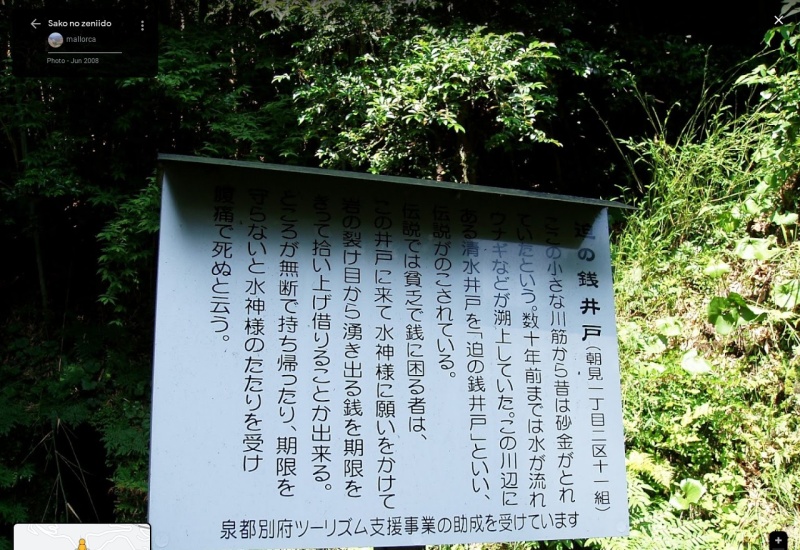【迫の銭井戸】(大分県の湧水)別府市朝見1丁目 昔、水神様にお願いするとお金を借りる事ができた 伝説の井戸 [湧水の名称] 迫の銭井戸(さこのぜにいど) [場所] 大分県別府市朝見1丁目3882 [言い伝え・概要] 川辺の井戸で昔は砂金が採れたと言われ、この井戸で期日を限って借りると誓えば金を借りられるが、守らないと祟りがあるという銭貸し伝説あり。 [保全活動] [Google クチコミ] こちら 出典 環境省ホームページ お気に入りに追加※自然の湧水は煮沸して飲用されるとより安全です。※水辺は水難や危険生物に十分気を付けてください。 Click to share on X (新しいウィンドウで開きます) X このエントリーをLINEで送る (新しいウィンドウで開きます) LINEに送る Facebook で共有するにはクリックしてください (新しいウィンドウで開きます) Facebook このエントリーをはてなブックマークに追加 (新しいウィンドウで開きます) はてなブックマーク 別府市 | 大分県 | 九州 投稿日: 2021年1月4日2023年7月9日 投稿者: Sumai事務局