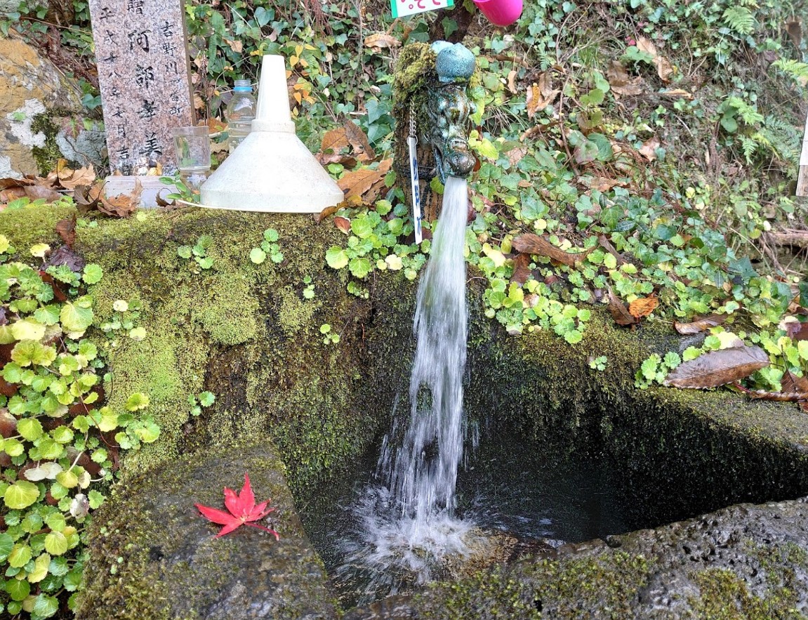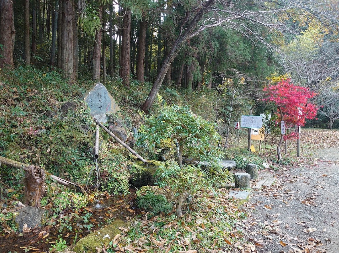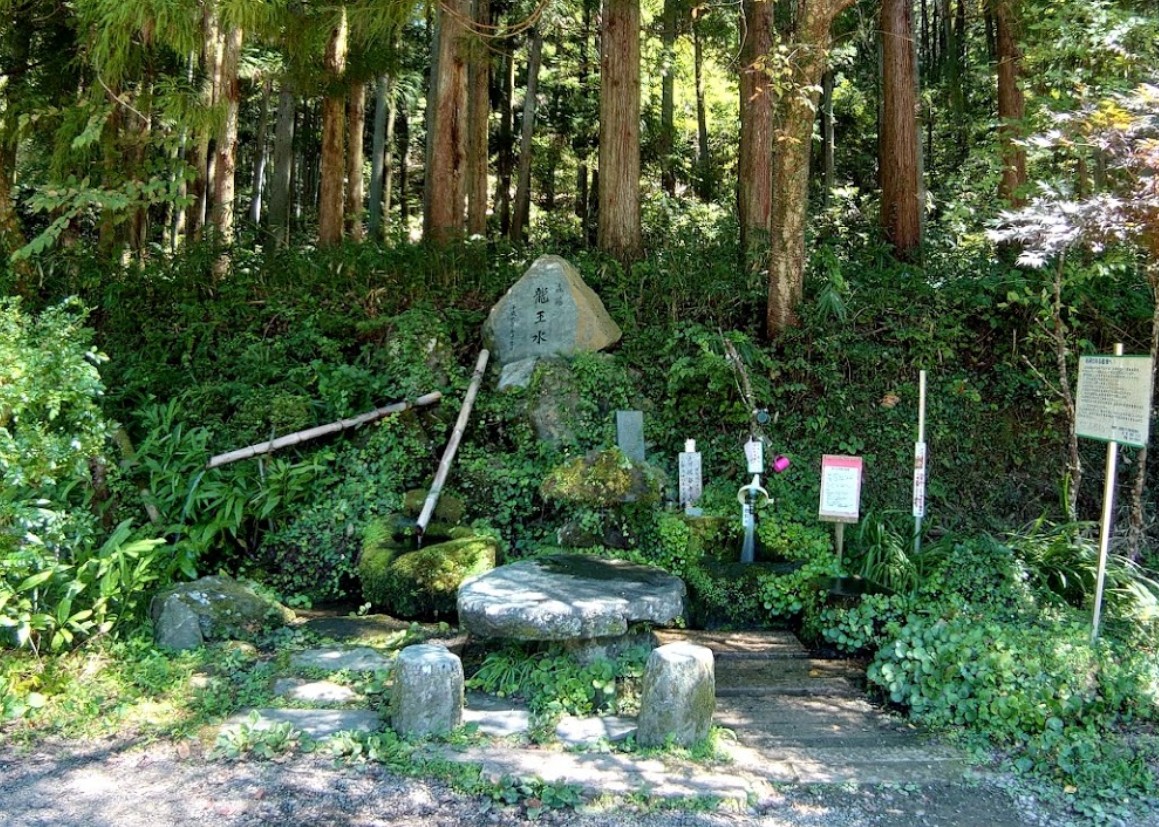 高さ20mと云われる楠の御神木がある八大龍王社から山の方へ200m程進んだ所にある湧水。龍の形の取水口から勢いよく流れている。