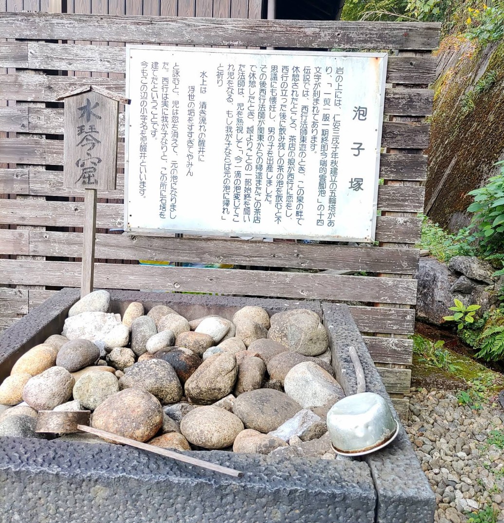 西行法師の子が泡となって消えたという伝説が残る泡子塚のそばに水琴窟がある。
