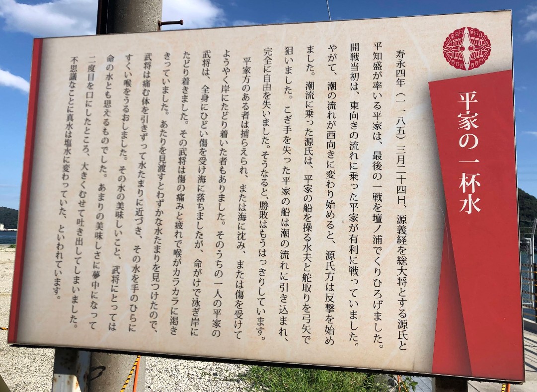 壇ノ浦の戦いで敗戦し、深手を負い命からがらようやく岸にたどり着いた一人の平家武将が岸にたどり着いた後、この地で水たまりを見付けて手ですくって喉を潤した。余りの美味しさに二度目を飲んだところ、何故か真水が塩水に変わっていたという言い伝えがある。 伝説の地には祠が立てられ、今も元旦の若水として赤間神宮の神前に供えらえられている。 |