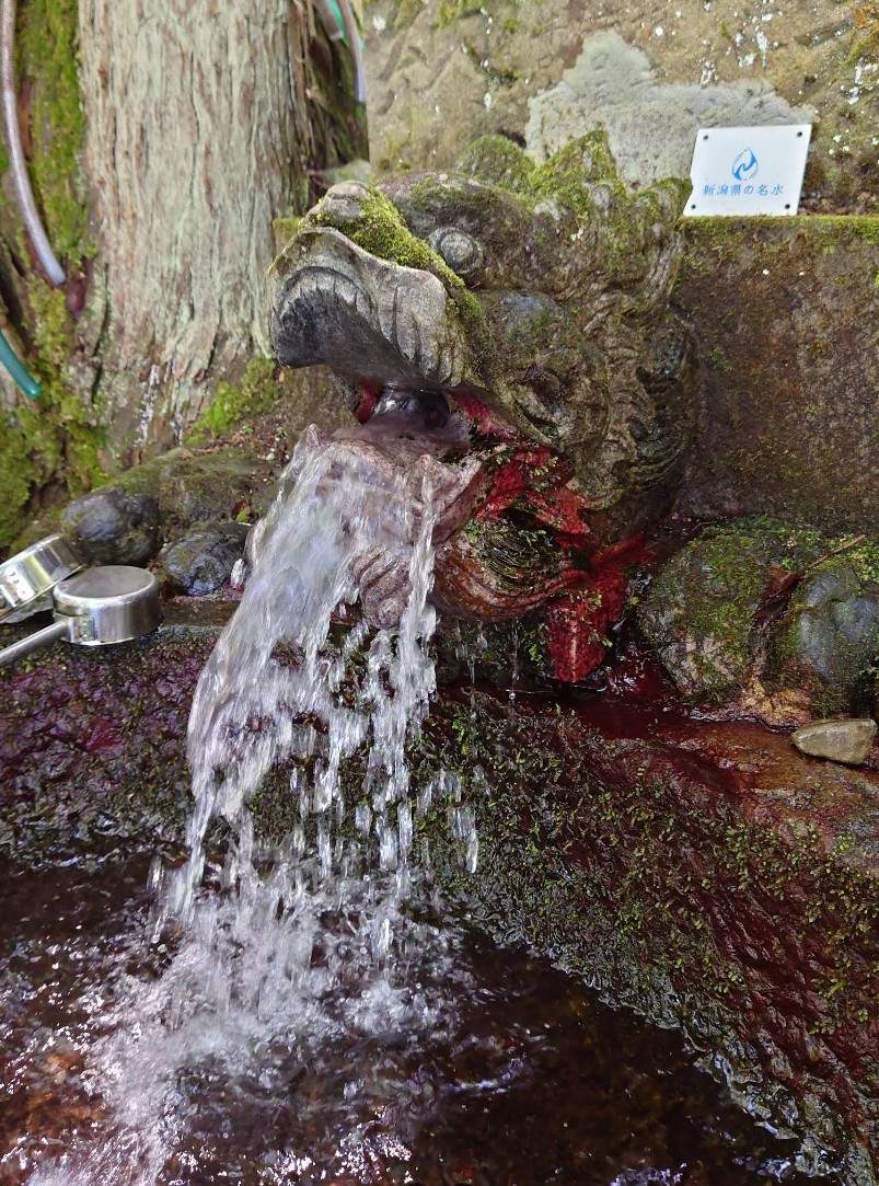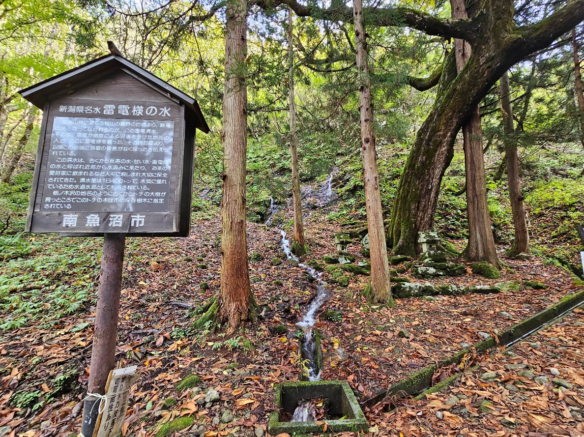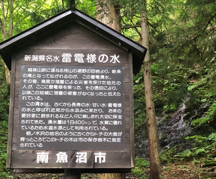 水量は400t/日であり、一部を水道水源として、また、清酒の源水としても利用されている。 周囲には栃の大樹があり、幾度か落雷による人身災害があったことから、この大樹の下に雷電様を祭り、その信仰により以後この地に落雷の被害がなくなったと伝えられている。 |