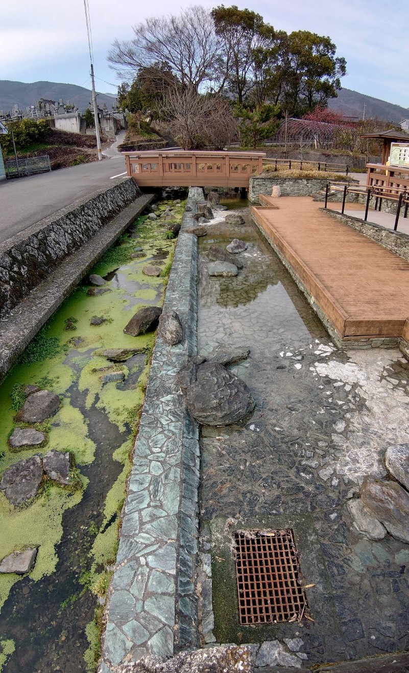 【寺町湧水広場】(徳島県の水場)美馬市美馬町願勝寺 寺院の立ち並ぶ閑静な場所 ウッドデッキや橋が整備された鑑賞水路