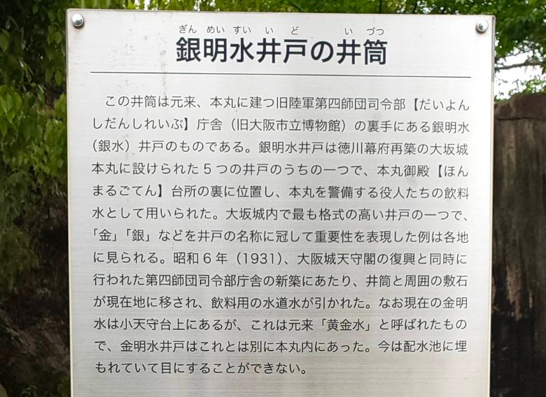 | [言い伝え・概要] | 銀明水井戸は徳川幕府再築の時、大坂城本丸に設けられた5つの井戸の内の1つです。
