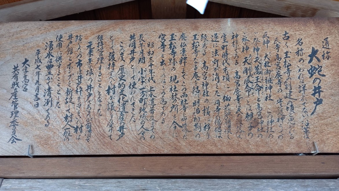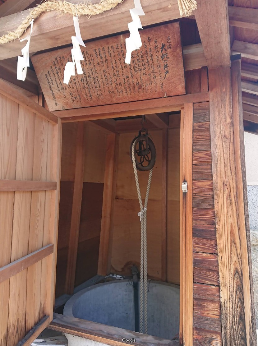 昔、井戸の近くに森があり、そこにすみついた大蛇がよくこの井戸の近くで見られたことから名づけられたと伝えられています。 高宮神社の鳥居の前を50メートルほど東へいったところに井戸屋形があります。屋形は瓦葺きで三方を囲い、一方を方開きの戸にしてここから水を汲むようになっています。 市内には弘法井戸といわれる井戸が打上・国松・田井・湯屋が谷に残っています。その他にも平池の清水の井戸、高宮の大蛇の井戸があります。 古い記録には、高宮の一ツ井、国松のニツ井、三井の三ツ井と記されていますが、三井は地名として残るほどの名水で、酒造りには欠かせないものでした。秦には刀鍛冶(かたなかじ)が使ったといわれる井戸もありました。 |