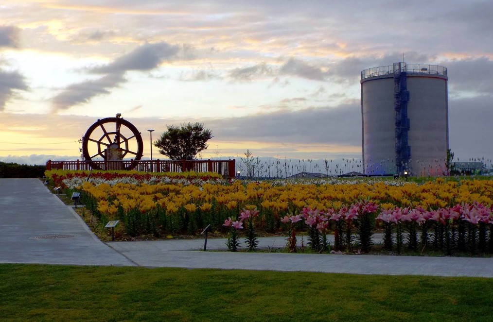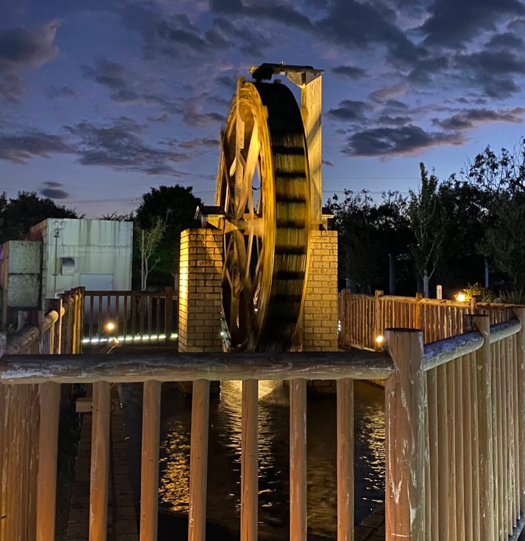 【ユリの里公園 水車】(福井県の水場)坂井市春江町石塚 BBQ・デイキャンプ・ドッグランができる公園で 夕暮れと百合の花に映える水車
