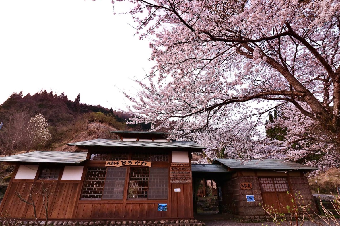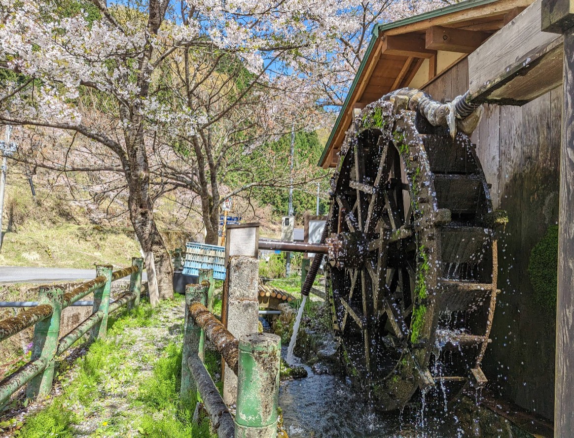平成初期に建設された小屋は水車で杵つきをしながらうどん店として2005年まで営業され、12年程使われていなかったが、2017年に復活した。 春の桜の時期には、落ちた桜の花びらを纏って水車の回る姿がとても風流となっている。 |