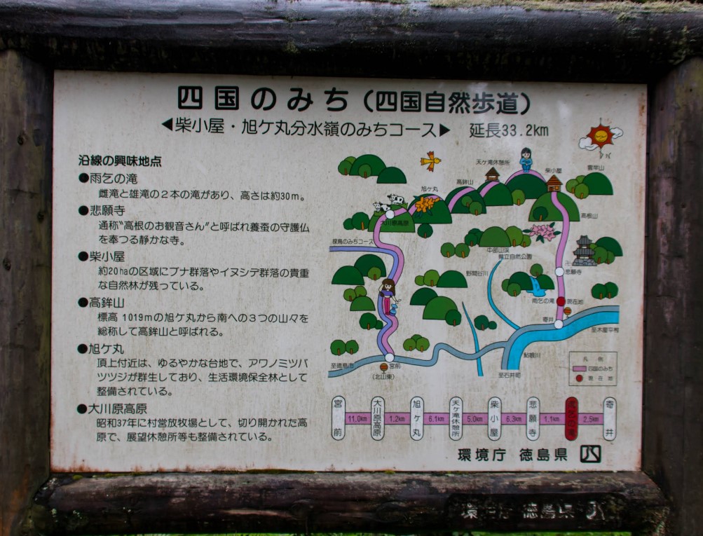 竜王神と不動尊が祭られていて、昔日照りが続いたときに村人たちが太鼓をたたいて踊りを奉納して雨乞いをおこなった。 日本の滝百選、四国のみずべ八十八か所、とくしま88景、とくしま水紀行50選など数々の名勝にしていされている。 駐車場から川の流れに沿って歩道を歩き出すと、途中うぐいす滝・不動滝・ 地獄淵・もみじ滝・観音滝がある。 |