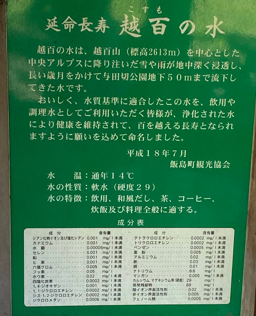 【越百の水】(長野県の湧水)上伊那郡飯島町飯島 中央アルプスに降り注がれた雨雪が 長い歳月をかけて公園下まで浸透した軟水 [名称] 越百の水(こすものみず) [場所] 長野県上伊那郡飯島町飯島25 [言い伝え・概要] 中央アルプス越百山周辺の山岳地帯で長い年月かけて涵養された地下水を、与田切公園内にある井戸で汲み上げている。 軟水であり、多く人が水汲みに訪れる。 [保全活動] [Google クチコミ] こちら 出典 (一社)長野伊那谷観光局 お気に入りに追加※自然の湧水は煮沸して飲用されるとより安全です。※水辺は水難や危険生物に十分気を付けてください。 Click to share on X (新しいウィンドウで開きます) X このエントリーをLINEで送る (新しいウィンドウで開きます) LINEに送る Facebook で共有するにはクリックしてください (新しいウィンドウで開きます) Facebook このエントリーをはてなブックマークに追加 (新しいウィンドウで開きます) はてなブックマーク (種類)軟水 飯島町 | 上伊那郡 | 中部 | 長野県 投稿日: 2025年9月22日2025年9月22日 投稿者: Sumai事務局
