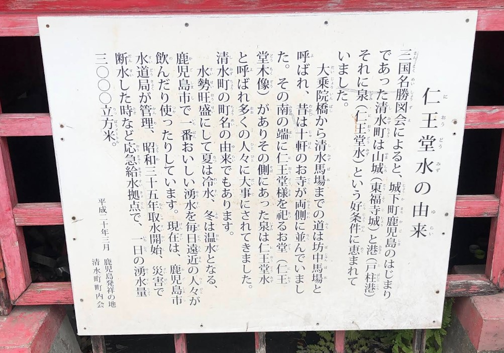 この付近は、島津家の菩提寺・福昌寺や、初代島津忠久から5代貞久を祀った本立寺などの古刹も多く、江戸期には門前町としてにぎわっていた。 また、2008年3月に清水町町内会が御堂に掲示した案内板によれば、篤姫の実家にあたる今和泉島津家の下屋敷がこの清水に隣接して建っていた。幼少期の於一もここの水を飲んだのではないかと言われている。 現在は、1960年から鹿児島市水道局が取水を開始し、災害時の給水拠点にもなっている。今でも1日3,000㎥の湧水量を誇り、往時と変わらず人びとに親しまれている。 |