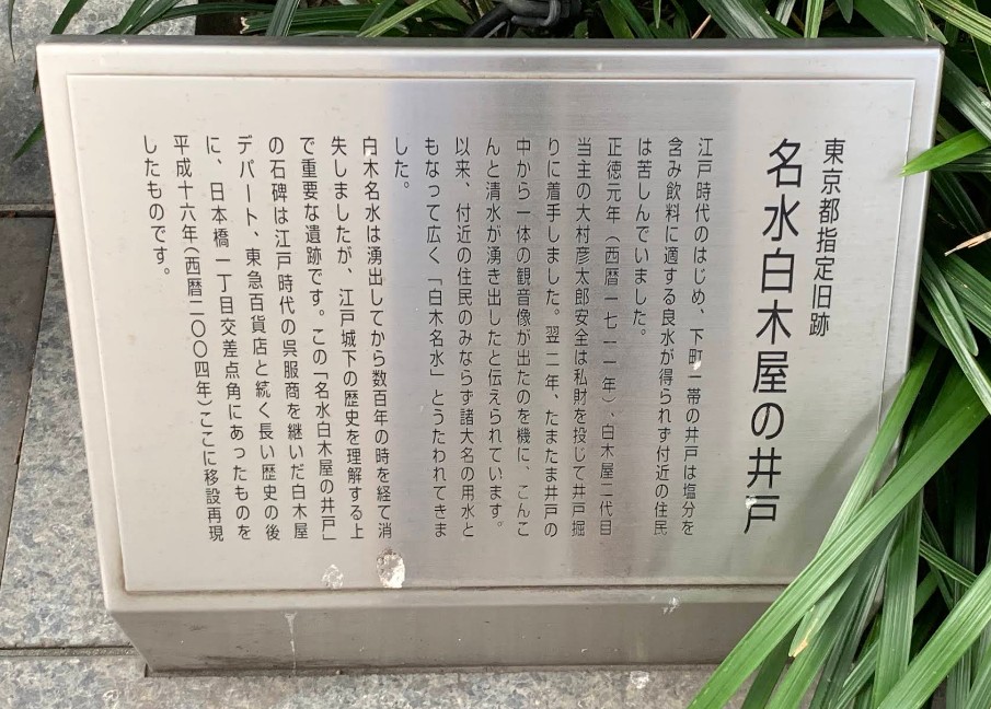 | [言い伝え・概要] | コレド日本橋の裏手、ひっそりとした裏通りに東京都の指定旧跡「名水白木屋の井戸」があります。