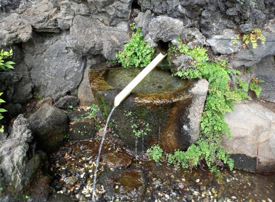 湧水は参道の階段手前に引水されていて、手水等ができるようになっている。