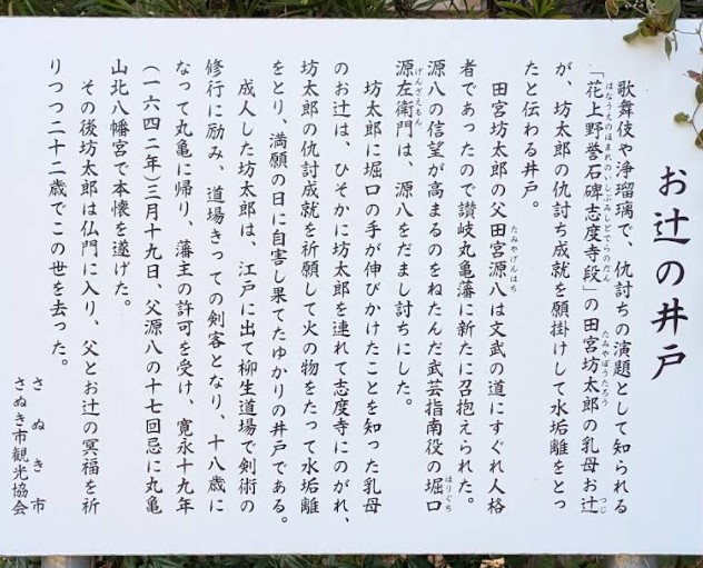 歌舞伎や浄瑠璃で敵討ちの演題として有名な『花上野誉石碑(はなのうえのほまれのいしぶみ)』で主人公・田宮坊太郎の乳母・お辻が、坊太郎の敵討ち成就の願掛けに水垢離したと言われる井戸。