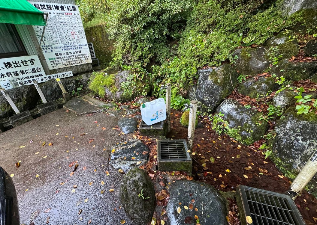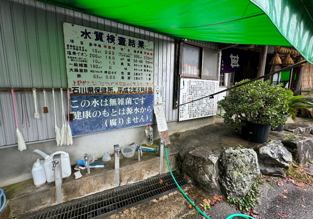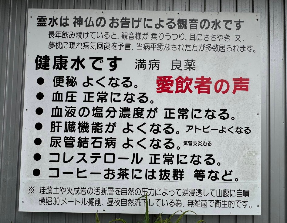 珪藻土や火成岩の活断層を自然の圧力によって逆浸透して山腹に自噴 横堀30メートル掘削、昼夜自然流下している為、無雑菌で衛生的です。 (現地掲示板より) |