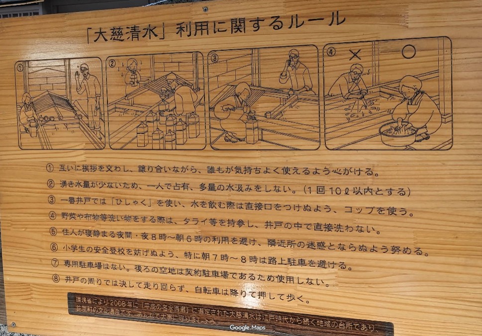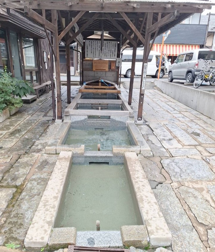 吐水井から順に一番井戸は飲み水、二番井戸は米磨ぎ水、三番井戸は洗い物、四番井戸は足洗いと井戸の用途が定まっており、多くの人が安心して使うことができるように水利用のルールがある。 |