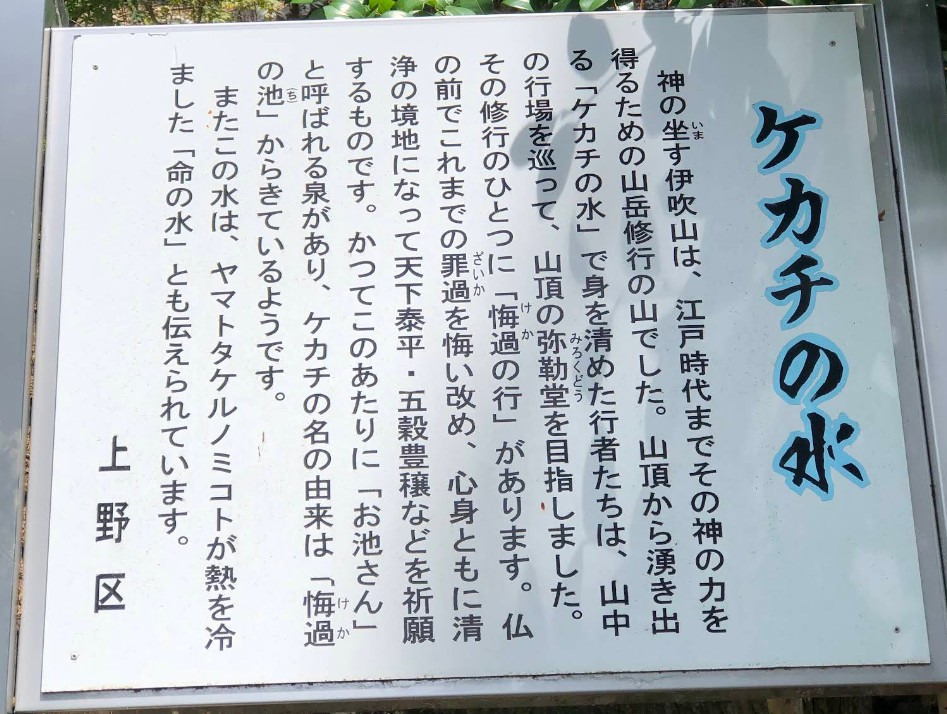 行者たちは伊吹山から湧き出る「ケカチの水」で身を清めて行場を巡り山頂の弥勒堂を目指した。 その修行のひとつ「悔過の行(けかのぎょう)」はこれまでの罪過を悔い改め、心身ともに清浄の境地になって天下泰平・五穀豊穣などを祈願したとされる。 また、この水はヤマトタケルノミコトが熱を冷ました「命の水」とも伝えられる。 (現地掲示板要約) |