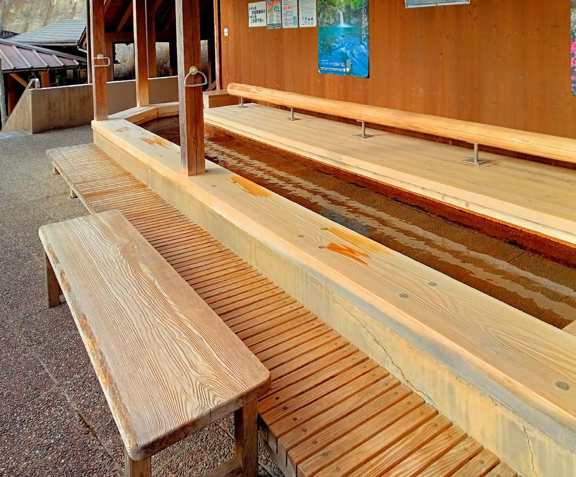 [言い伝え・概要] 二津野ダム湖を展望する日帰り温泉「庵の湯」にある足湯と飲泉所。
