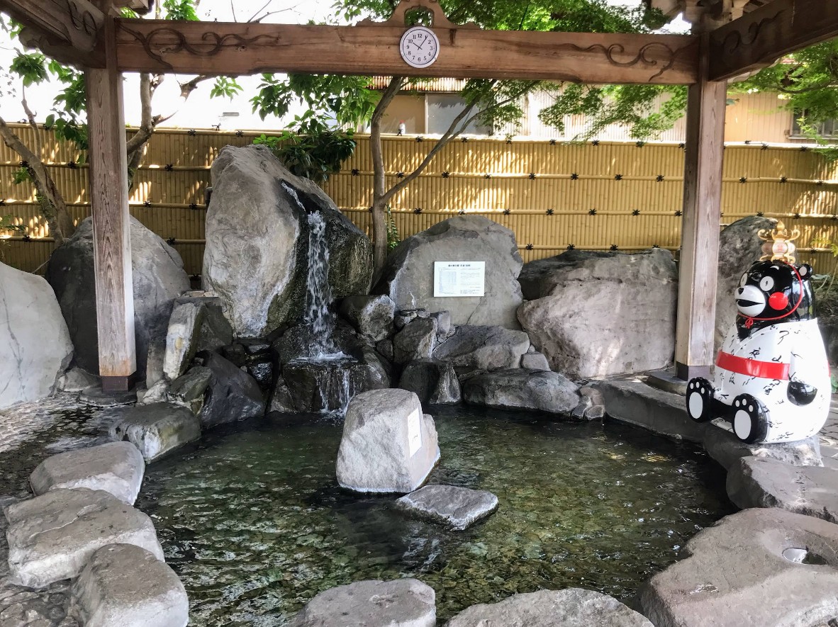 【湯の端公園 あし湯】(熊本県の水場)山鹿市山鹿 街角の公園内 小石が足ツボを刺激する 重厚な屋根の無料足湯