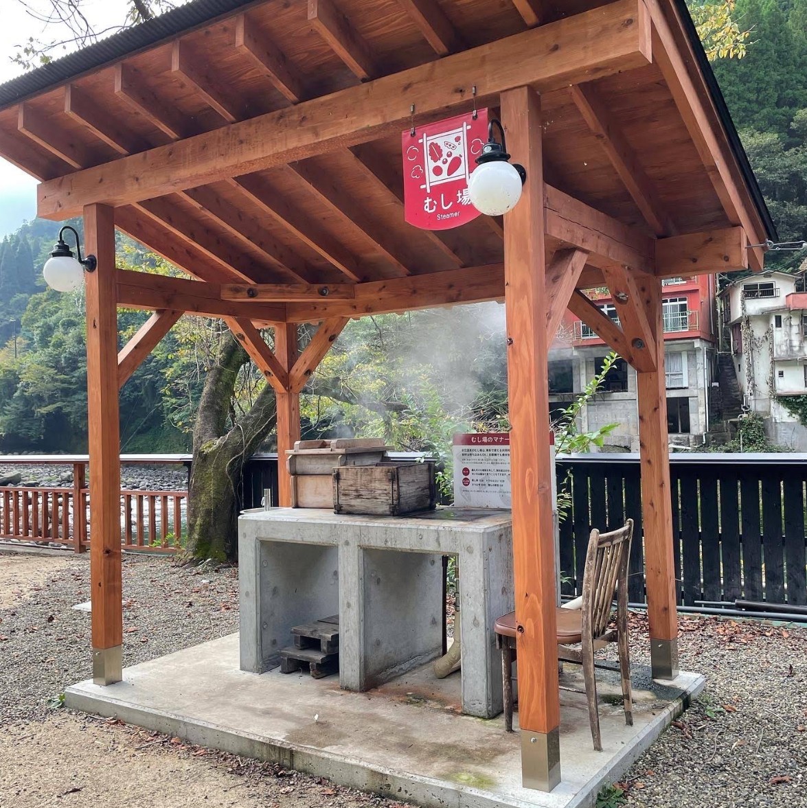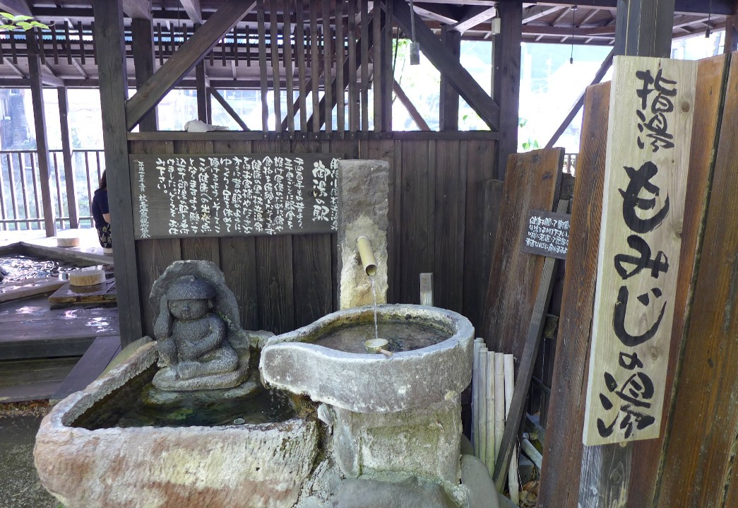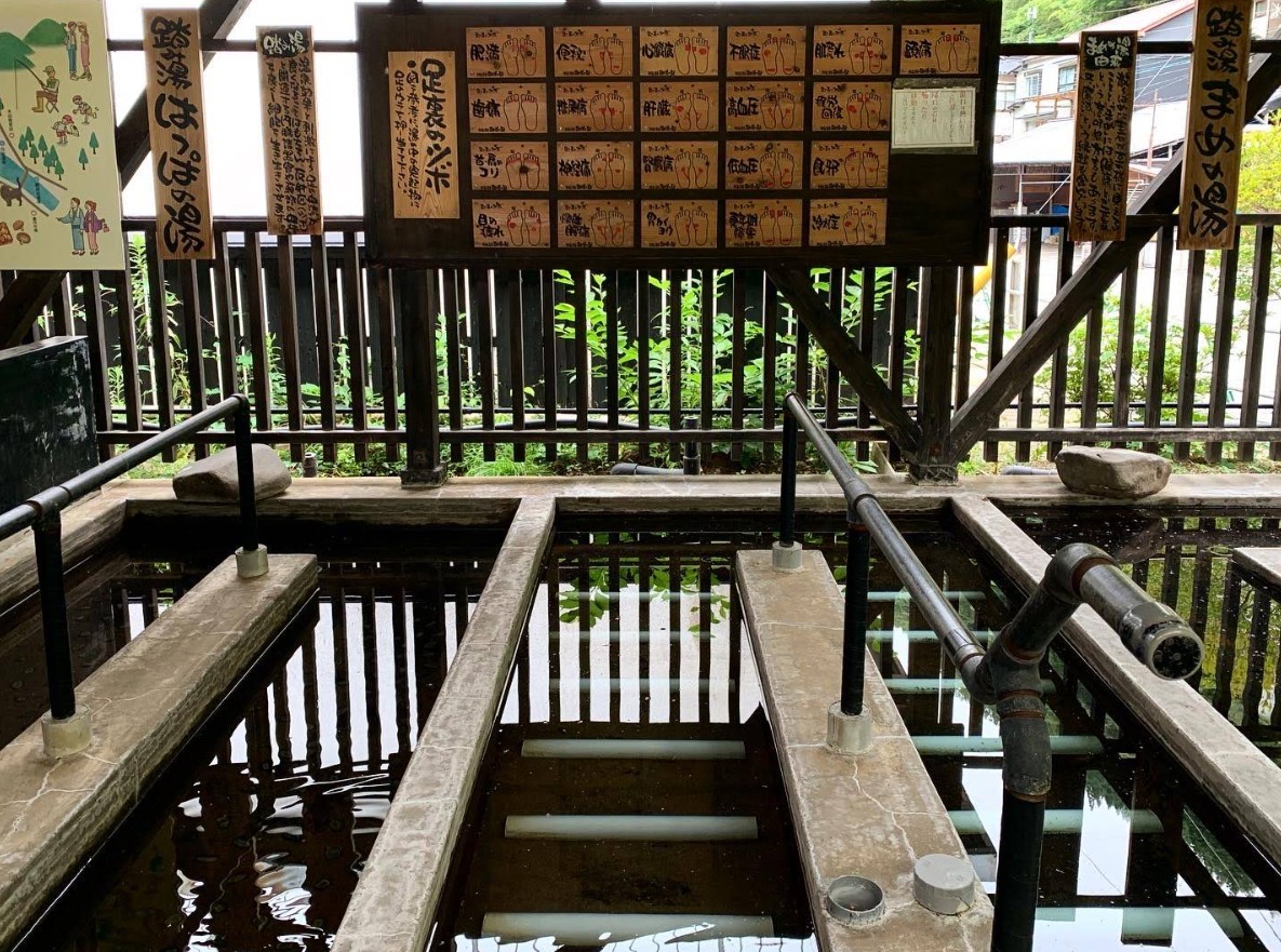 | [言い伝え・概要] | 観光案内所近くにある足湯「御湯の駅」。足をお湯に浸す普通の足湯から、足裏のツボを刺激する歩行湯まで、さまざまな種類の足湯が楽しめます。なかでも砂むし足湯は珍しく、砂利の適度な重さと温かさが気持ち良いと評判です。どの足湯も無料で利用できるので、杖立散策のひと休みにお立ち寄りください。