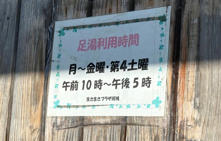 【生き生きプラザ斑鳩 足湯】(奈良県の水場)生駒郡斑鳩町小吉田 保健福祉施設の入口にある 足裏マッサージができる屋根付き無料足湯 [名称] 生き生きプラザ斑鳩 足湯 [場所] 奈良県生駒郡斑鳩町小吉田1丁目12−35 [言い伝え・概要] 保健福祉施設「生き生きプラザ斑鳩」内にある足湯。 足湯内には丸石が敷き詰められ、足裏マッサージができるようになっている。 利用時間 月~金・第4土曜の朝9時から夕方5時まで [保全活動] [Google クチコミ] こちら 出典 斑鳩町 お気に入りに追加※自然の湧水は煮沸して飲用されるとより安全です。※水辺は水難や危険生物に十分気を付けてください。 Click to share on X (新しいウィンドウで開きます) X このエントリーをLINEで送る (新しいウィンドウで開きます) LINEに送る Facebook で共有するにはクリックしてください (新しいウィンドウで開きます) Facebook このエントリーをはてなブックマークに追加 (新しいウィンドウで開きます) はてなブックマーク (場所)足湯 生駒郡 | 斑鳩町 | 近畿 | 奈良県 投稿日: 2025年11月10日2025年11月10日 投稿者: Sumai事務局