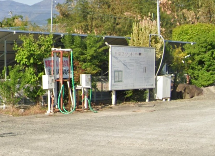 【今諏訪温泉「御柱の湯」温泉源泉販売】(山梨県の水汲み場)南アルプス市上今諏訪 県道沿いの広い駐車場の片隅にある 格安温泉スタンド