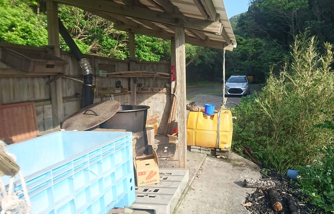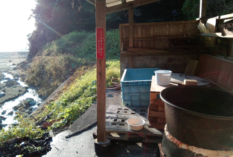 伊能忠敬が休息で浸かった、海辺の巨大鮫が傷を治しに近づいた、等数々の伝説も残っている。 海を望む湯舟は五右衛門風呂となっており、燃料は海で調達するように書かれている。 硫黄は皮膚病や美肌効果に効くといわれている。 ただし、クチコミによれば現在温泉水は溜められておらず、自力で川からバケツで汲んで入るようになっているとのこと。流木は常にあるかどうか分からないので、薪も持参した方がよいとの情報がある。 |