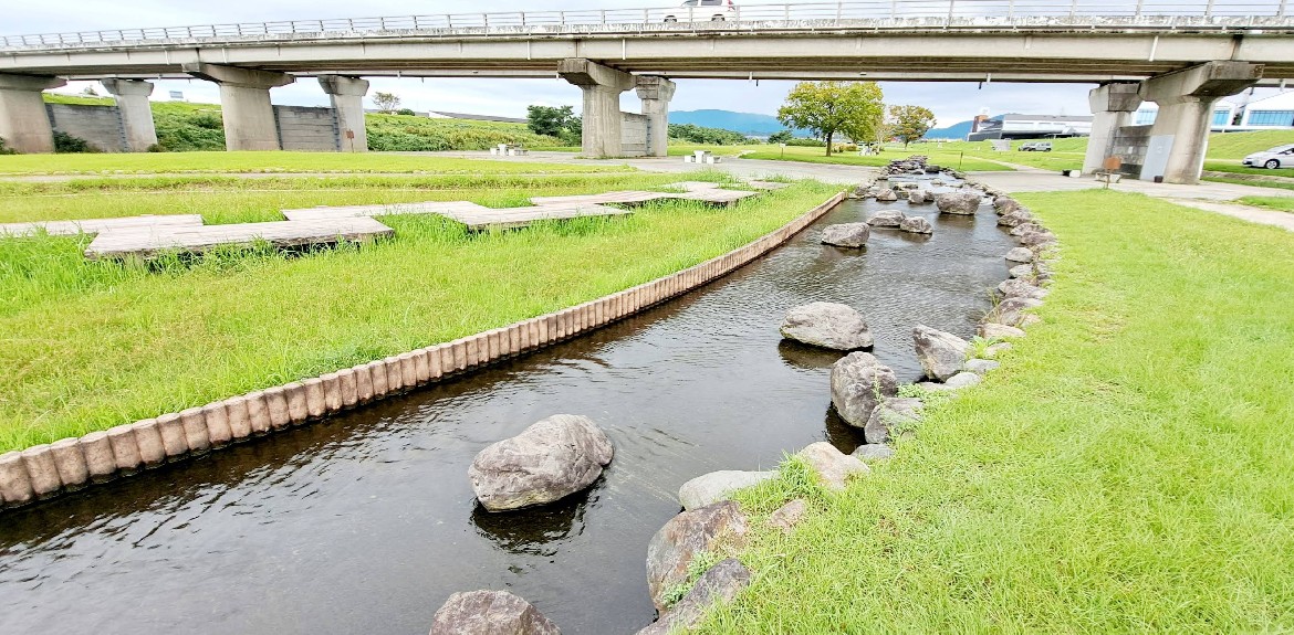 【親水公園】(宮崎県の水場)都城市郡元町 河川敷に続く水路と一面の緑は 憩いの散策スポット