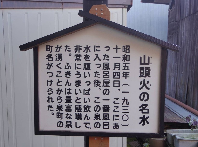 俳人の種田 山頭火(たねだ さんとうか)が、この場所にあった風呂屋の一番風呂に入った後に、腹いっぱい飲んで非常にうまいと感嘆したと伝わる名水。